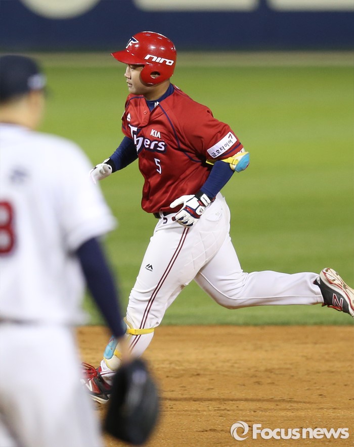 (서울=포커스뉴스) 18일 서울 잠실구장에서 열린 2016프로야구 KIA-두산 경기 5회초 KIA 황대인이 김주형에 이어 백투백으로 좌월 홈런을 치고 베이스를 돌고 있다.