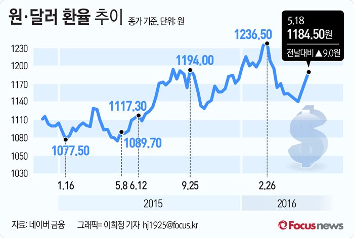 미 금리 인상 이슈가 없었지만 당시 원화 가치는 안전자산 선호 심리로 변동성은 더욱 커졌다. 8월 12일 원·달러 환율은 1190.8원으로 1200원대를 위협했으며 중국 증시 대폭락이 진행됐던 9월 2~7일 원·달러 환율은 1180.7~1203.7원을 기록했다.(서울=포커스뉴스) 미국 연방준비제도의 4월 공개연방시장위원회(FOMC)의사록이 18일(현지시각) 공개됐다. 6월 금리 인상 가능성이 높아지면서 원·달러 환율은 크게 상승하고 있다. 이는 작년 미국 금리 인상설이 불거졌을 때와 비슷한 흐름이다. 2016.05.19 이희정 기자