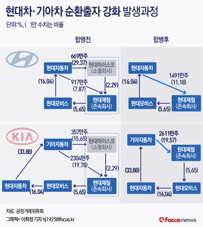 현대·기아차는 지난해 7월 1일 현대제철·현대하이스코 간 합병으로 현대제철의 합병 신주를 취득하면서 계열사 간 순환출자가 강화된 바 있다.