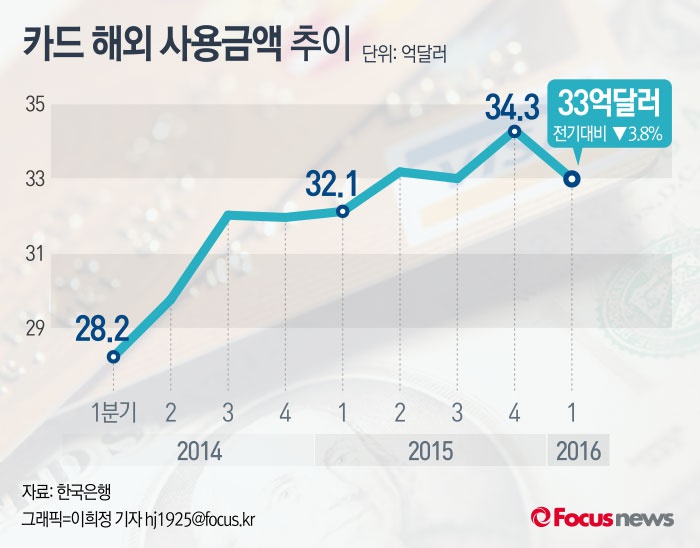 (서울=포커스뉴스) 한국은행이 20일 발표한 '2016년 1분기 중 거주자의 카드 해외사용 실적'에 따르면 올 1분기 국내 거주자가 해외에서 사용한 카드금액은 33억달러(약3조9000억원)로 지난해 4분기 대비 3.8% 감소했다.