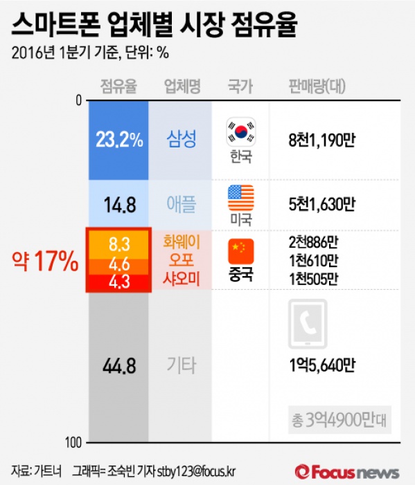 (서울=포커스뉴스) 20일 시장조사기관 가트너 자료에 따르면 올해 1분기 화웨이(8.3%)와 오포(4.6%), 샤오미(4.3%) 등 3개 중국 기업이 포함됐고, 이들이 시장점유율 17%를 차지했다.