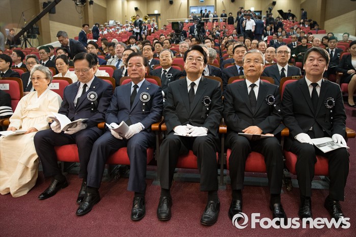 (서울=포커스뉴스) 21일 오전 서울 여의도 국회에서 엄수된 故 김재순 전 국회의장 국회장 영결식에 정의화 국회의장(왼쪽 두번째부터), 정갑윤 국회부의장, 정진석 새누리당 원내대표, 김종인 비대위 대표, 안철수 국민의당 상임공동대표가 참석하고 있다.