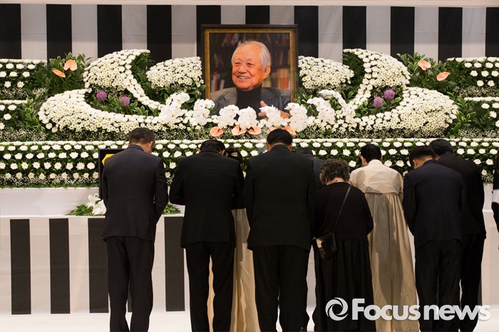 (서울=포커스뉴스) 21일 오전 서울 여의도 국회에서 엄수된 故 김재순 전 국회의장 국회장 영결식에 유가족들이 헌화 후 묵념하고 있다.