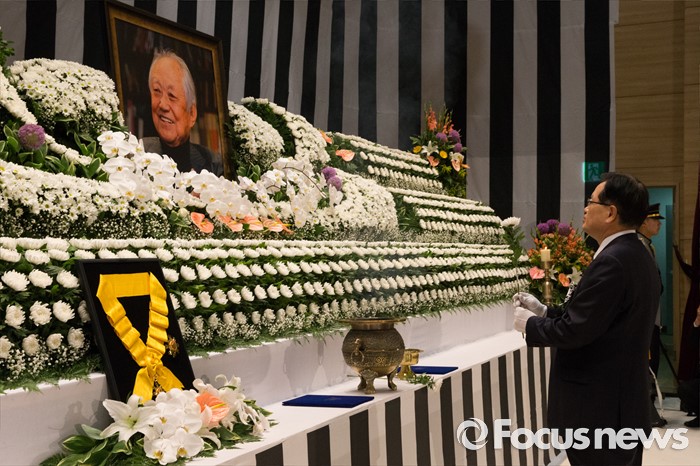 (서울=포커스뉴스) 21일 오전 서울 여의도 국회에서 엄수된 故 김재순 전 국회의장 국회장 영결식에서 정의화 국회의장이 헌화를 하고 있다.