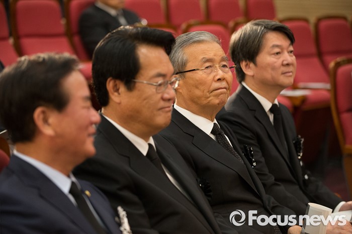 (서울=포커스뉴스) 21일 오전 서울 여의도 국회에서 엄수된 故 김재순 전 국회의장 국회장 영결식에 정진석(왼쪽 두번째) 새누리당 원내대표와 김종인 비대위 대표, 안철수 국민의당 상임공동대표가 참석하고 있다.