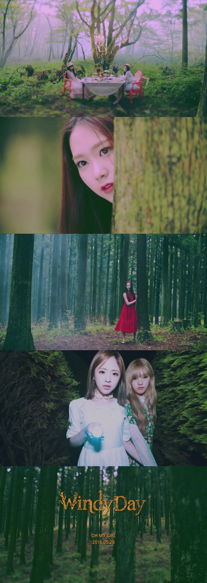 타이틀곡 ‘윈디데이’ 뮤비 스팟 영상 속에서 오마이걸 멤버들은 상큼한 여름 소녀들로 변신, 숲속에서 만찬을 즐기고 있다가 갑자기 거센 바람과 함께 알 수 없는 미로 속으로 이끌려가며 오마이걸의 트레이드마크와도 같은 동화 같은 분위기가 연출된다.