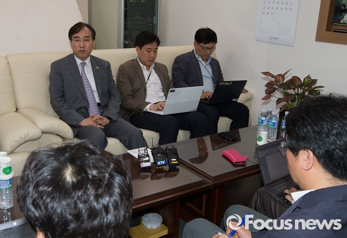 (세종=포커스뉴스) 이석준(뒷줄 왼쪽) 국무조정실장이 23일 오후 세종시 정부세종청사 국무총리비서실·국무조정실 기자실에서 출입기자단과 국정현안에 대한 간담회를 갖고 있다. 이 국조실장은 상시 청문회법과 관련해 앞으로 행정부 공무원들의 업무 위축 우려 가능성이 높다고 밝혔다.