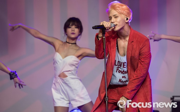 (서울=포커스뉴스) 23일 오후 서울 강남구 플래툰 쿤스트할레에서 가수 종현이정규 1집 앨범 '좋아'를 발표하고 무대를 선보이고 있다.