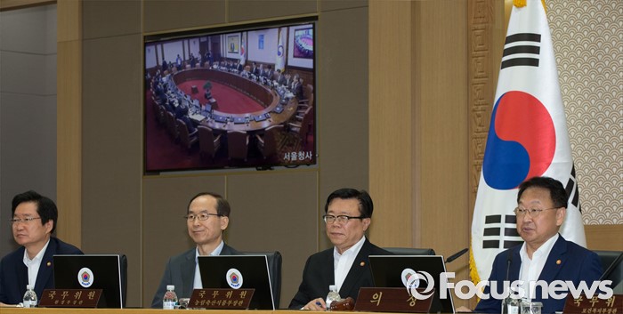 (세종=포커스뉴스) 유일호(오른쪽) 경제부총리 겸 기획재정부장관이 24일 오전 세종시 정부세종청사 국무회의장에서 서울-세종 영상회의로 열린 국무회의를 주재하고 있다.