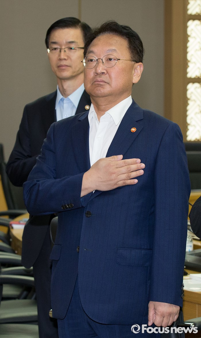 (세종=포커스뉴스) 유일호(오른쪽) 경제부총리 겸 기획재정부장관이 24일 오전 세종시 정부세종청사 국무회의장에서 서울-세종 영상회의로 열린 국무회의에 참석해 국기에 대한 경례를 하고 있다. 왼쪽은 방문규 보건복지부 차관.