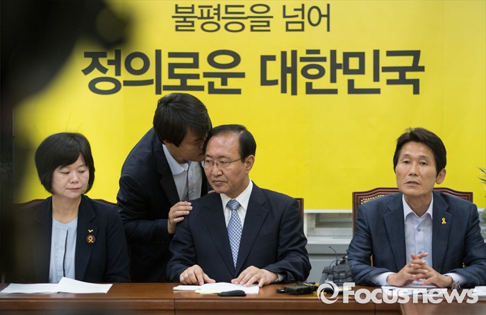 (서울=포커스뉴스) 노회찬(가운데) 정의당 원내대표가 24일 오전 서울 여의도 국회에서 열린 당선자 총회에서 당직자와 대화하고 있다. 왼쪽부터 이정미 정의당 당선인, 노 원내대표, 윤소하 당선인.