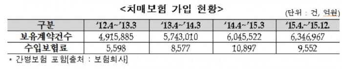 금감원에 따르면 치매보험 가입자는 매해 늘어나는 추세다. 2012년 4월부터 2013년 3월까지 보유계약건수 491만5885건(수입보험료 5598억원)이었던 치매보험은 2015년 중 634만6967건(9552억원)으로 대폭 늘어났다.