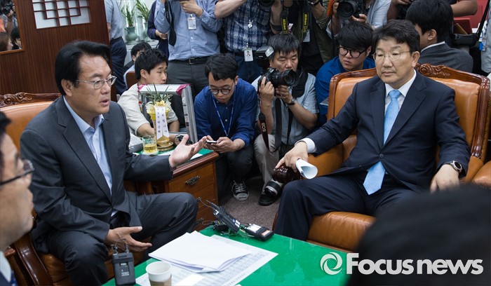 (서울=포커스뉴스) 정진석 새누리당 원내대표와 권성동 환노위 여당 간사가 24일 오전 서울 여의도 국회에서 가습기살균제 피해자와 가족 모임 면담에 앞서 대화하고 있다.