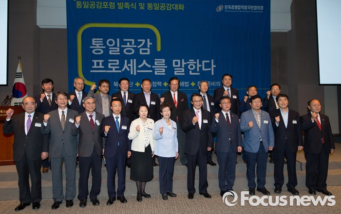 (서울=포커스뉴스) 천안함 피격사건을 계기로 5·24 대북제재 조치가 취해진 지 6년이 되는 날인 24일 오후 서울 중구 프레스센터에서 열린 '통일공감포럼 발족식 및 통일공감대화'에 참석한 홍용표(앞줄 오른쪽 네번째) 통일부 장관을 비롯한 내빈들이 기념촬영 하고 있다.