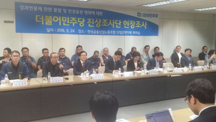24일 산업은행 노동조합은 더민주당이 이 은행을 방문해 사측이 성과연봉제 찬성 동의서를 받는 과정에서 인권 유린 소지가 있었는지 등을 조사했다고 밝혔다.