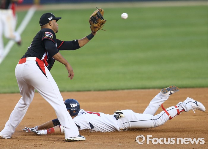 (서울=포커스뉴스) 24일 서울 잠실구장에서 열린 2016프로야구 kt-두산 경기 3회말 두산 선두타자 허경민이 우중간 펜스 앞에 떨어지는 3루타를 치고 슬라이딩하며 세이프되고 있다.