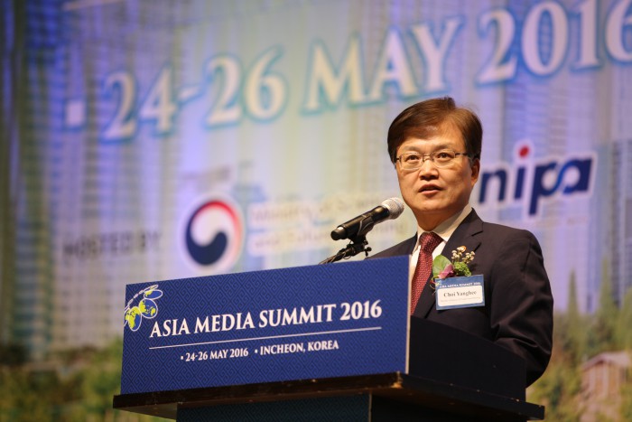 최양희 미래부 장관은 아시아미디어서밋(AMS) 환영사에서 “빠르게 발전하는 방송기술과 서비스의 진화에 걸맞는 콘텐츠 제작이 중요하다”며 “아‧태지역 미디어 콘텐츠 산업의 동반성장을 위한 협력방안 토대를 모색하는 것이 중요하다”고 강조했다.