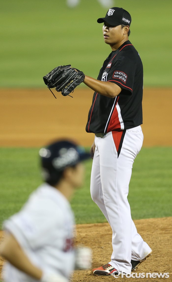 (서울=포커스뉴스) 24일 서울 잠실구장에서 열린 2016프로야구 kt-두산 경기 7회말 무사 1루에서 kt 투수 조무근이 두산 김재호를 볼넷으로 내보내고 있다.