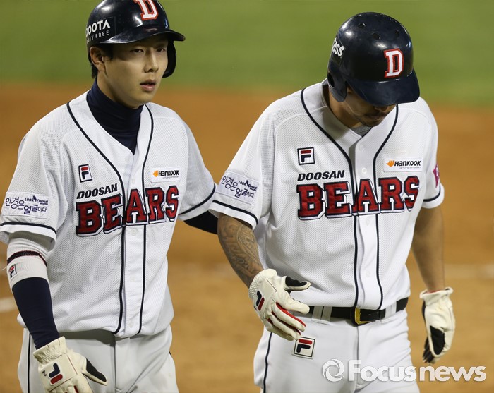 (서울=포커스뉴스) 24일 서울 잠실구장에서 열린 2016프로야구 kt-두산 경기 7회말 무사 1,2루에서 두산 민병헌의 3루타로 역전 득점한 박건우(왼쪽)와 오재원이 덕아웃을 향해 들어가고 있다.