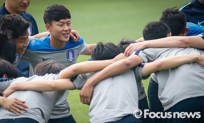 (파주=포커스뉴스) 이승우(18, 바르셀로나 후베닐A)가 25일 오후 경기도 파주 NFC에서 잉글랜드 U18(18세 이하) 대표팀과의 친선전을 앞두고 축구대표팀 선수들과 소집 훈련에 임하고 있다.