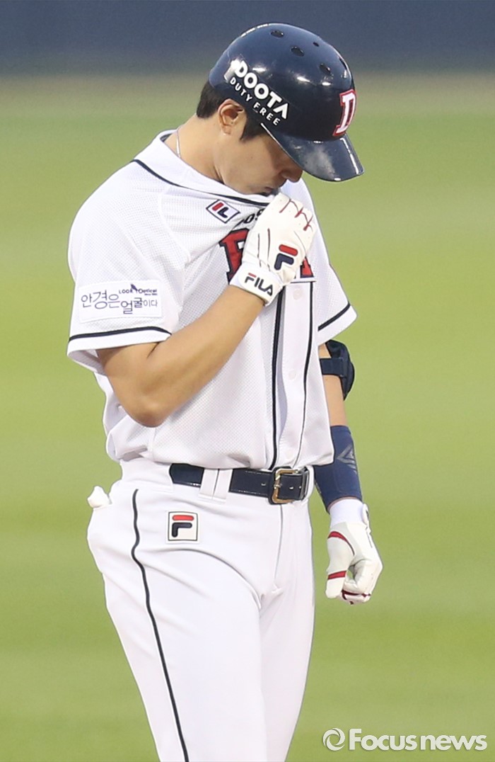 (서울=포커스뉴스) 25일 서울 잠실구장에서 열린 2016프로야구 kt-두산 경기 2사 1,3루에서 두산 김재호가 중견수 뒤로 빠지는 역전 2타점 2루타를 치고 자신의 유니폼에 키스하고 있다.