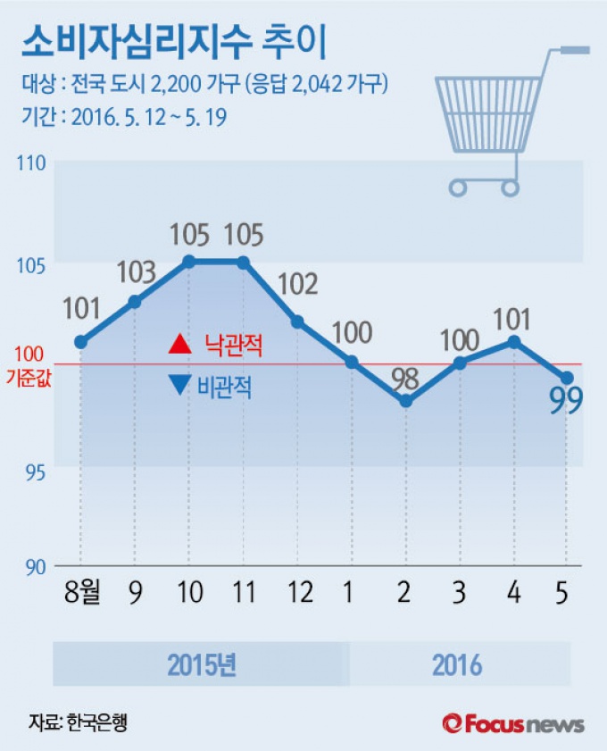 (서울=포커스뉴스)26일 한국은행은 ‘2016년 5월 소비자동향조사 결과’를 통해 5월 소비자심리지수는 99로 전월 대비 2포인트 하락했다고 밝혔다.