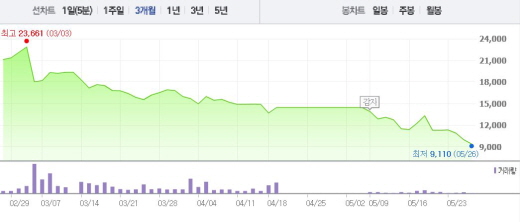 앞서 현대상선은 거래소의 채권단 7000억원 출자전환 및 대주주 7대 1 감자결정 보도에 대한 조회공시 요구에 “현대상선 채권금융기관협의회가 조건부 채무조정안(6840억원 출자전환 포함)을 가결했음을 통보받았다”며 “대주주 감자 등의 사항은 확정된 바가 없다”고 공시했다.주가흐름<사진출처=네이버 캡쳐>