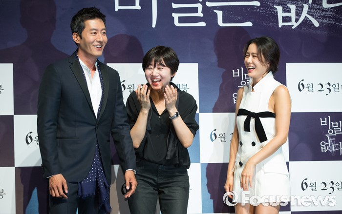 (서울=포커스뉴스) 26일 오전 서울 강남구 압구정 CGV에서 열린 영화 '비밀은 없다' 제작보고회에 참석한 배우 김주혁(왼쪽부터), 이경미 감독, 손예진이 환한 미소를 짓고 있다.