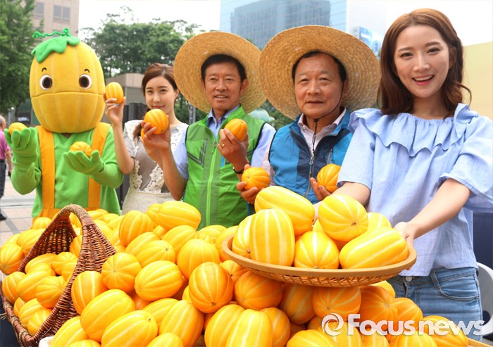 26일 서울 청계광장 참외 홍보부스에서 농민과 모델들이 참외를 들고, 포즈를 취하고 있다. 농협중앙회는 오는 29일까지 농협에서 운영하는 ‘농협a마켓’을 통해, 참외 3kg을 기존 1만5000원에서 1만원으로 최대 33% 할인 된 가격에 판매한다고 밝혔다.<사진제공=농협>