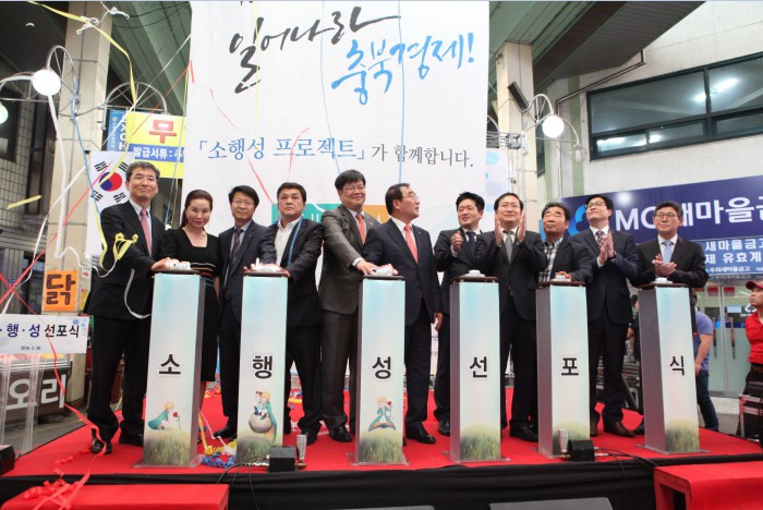 유정석 현대HCN 대표는 “지역사회의 모든 구성원들이 함께 대대적으로 노력해 지역경제를 살릴 수 있도록 노력을 아끼지 않겠다”며, “충북에서 시작된 프로젝트가 현대HCN의 모든 권역뿐만 아니라 전국의 지역경제 활성화에 이바지할 수 있도록 최선을 다하겠다”고 말했다.26일 충북 청주 육거리종합전통시장에서 열린 '소행성 선포식'에서 참가자들이 박수를 치고 있다.<사진제공=현대HCN>