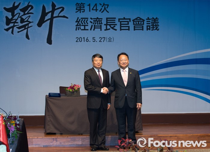 (서울=포커스뉴스) 유일호(오른쪽) 경제부총리 겸 기획재정부 장관과 쉬 사오스 중국 국가발전개혁위원회 주임이 27일 오전 서울 중구 신라호텔 영빈관에서 열린 제14차 한중경제장관회의에 참석해 악수하고 있다.