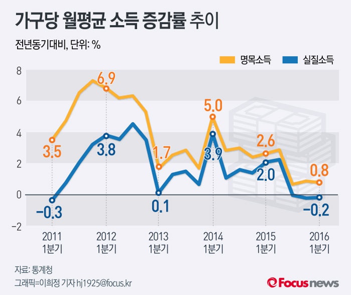 (서울=포커스뉴스) 27일 통계청이 발표한 자료에 따르면2016년 1/4분기 가구당 월평균 명목소득은 455만 5천원으로 전년동기대비 0.8% 증가했고, 물가상승을 제외한 실질소득 0.2% 감소했다.