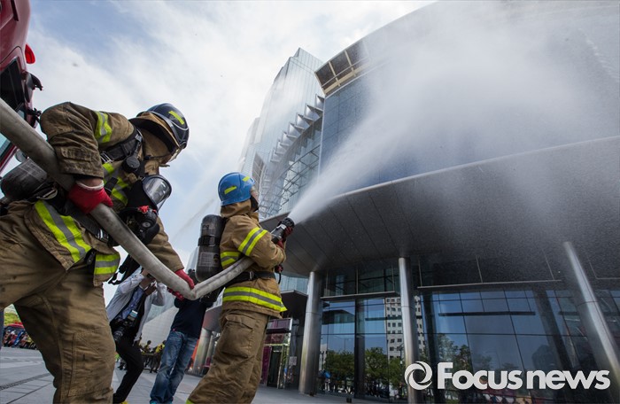 권순경 서울시 소방재난본부장은 "풍수해로 인한 피해를 최소화하기 위해 소방이 가진 역량을 최대로 발휘할 것"이라며 "방지할 수 있는 부분은 방지하고, 재난은 신속하게 처리하겠다"고 말했다.(서울=포커스뉴스) 20일 오후 서울 강남구 코엑스에서 열린 '2016 재난대응 안전한국훈련'에 참여한 소방대원들이 테러대응훈련을 펼치고 있다. 2016.05.20 양지웅 기자