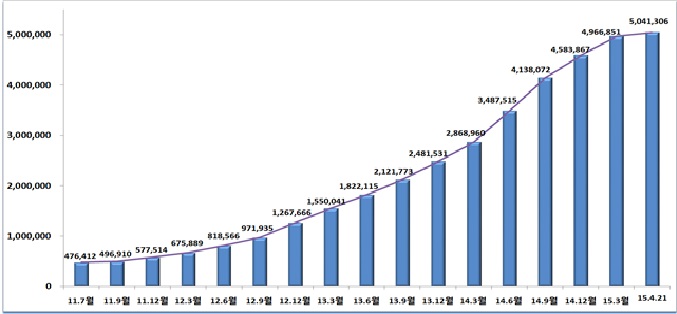 미래부는 기재부와의 협의를 통해 신중하게 판단하겠다는 입장이다. 미래부 관계자는 “통신시장 활성화를 위한 대책과 알뜰폰 전파사용료 모두 업계와 부처의 의견을 수렴해 협의중이며 곧 정책을 발표할 계획”이라고 말했다.알뜰폰 도입 이후 가입자 증가 추세.<그래프제공=미래부>