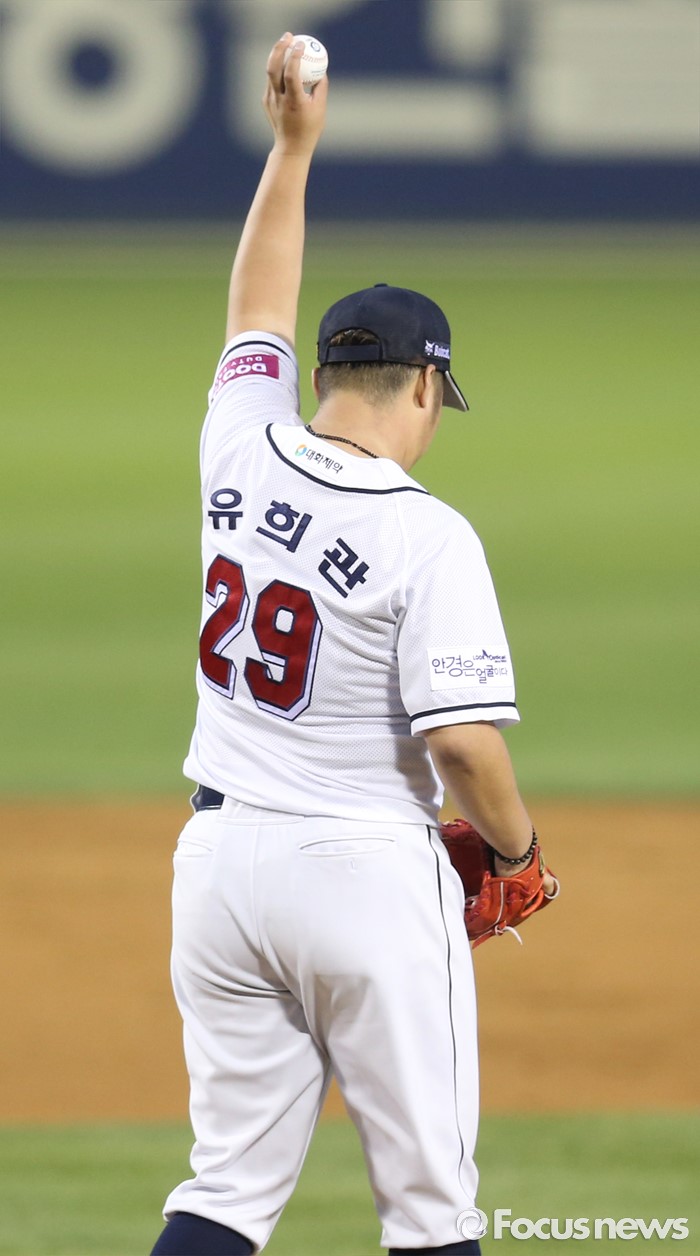 (서울=포커스뉴스) 27일 서울 잠실구장에서 열린 2016프로야구 LG-두산 경기 4회초 2사후 두산 투수 유희관이 중견수 민병헌에게 범실에 대해 개의치 말라는 사인을 보내고 있다.