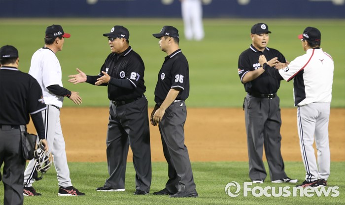 (서울=포커스뉴스) 27일 서울 잠실구장에서 열린 2016프로야구 LG-두산 경기 5회초, LG 양상문 감독이 이영재 2루심의 아웃 판정에 항의할떄 김정우 코치가 들어오자 최수원 심판이 이를 저지하고 있다.