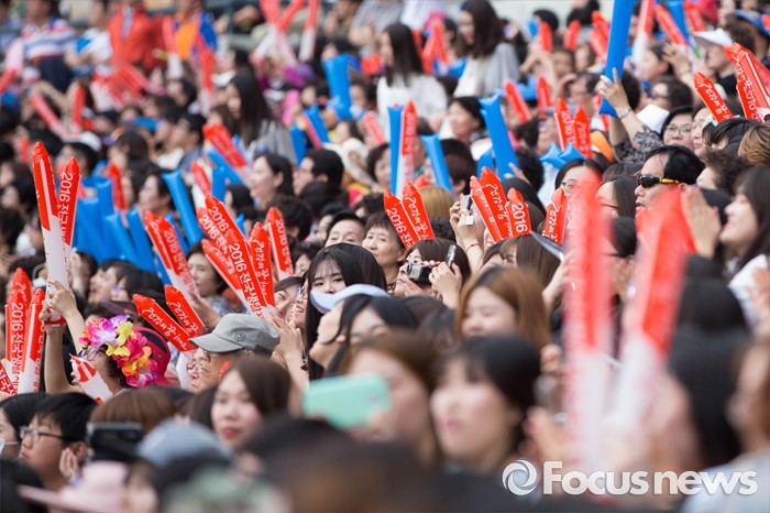 (서울=포커스뉴스) 2016 전국생활체육대축전 개막식이 열린 27일 오후 서울 송파구 잠실 올림픽주경기장에서 관람석에 앉은 시민들이 환호를 보내고 있다.