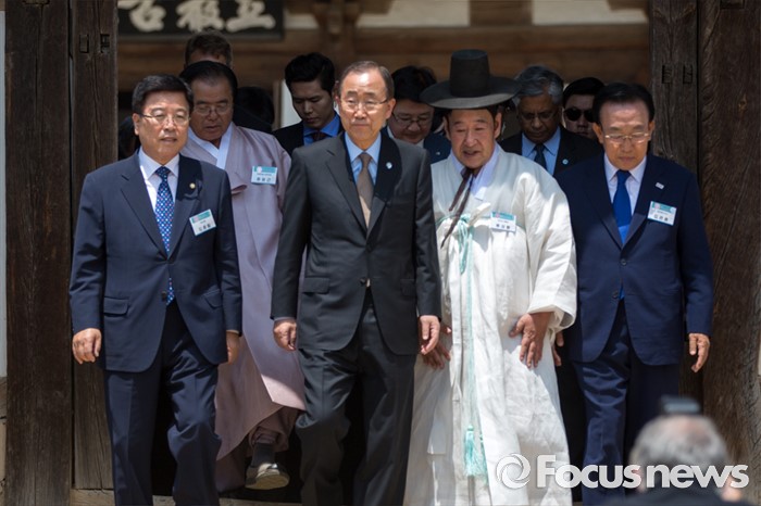 (안동=포커스뉴스) 반기문 UN 사무총장이 29일 오후 경북 안동시 하회마을 방문해 김광림(왼쪽) 새누리당 정책위의장, 김관용(오른쪽) 경북도지사등과 양진당을 둘러본 뒤 이동 하고 있다.