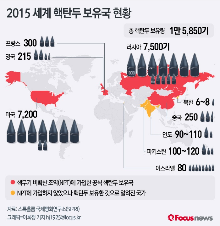 (서울=포커스뉴스) 스톡홀름 국제평화연구소(SIPRI는 9개 국가가 핵탄두 1만5850기를 보유하고 있다는 연구 보고서를 내놓았다. SIPRI는 핵을 보유한 국가로 미국, 러시아, 영국, 프랑스, 중국, 인도, 파키스탄, 이스라엘, 북한을 꼽았다.
