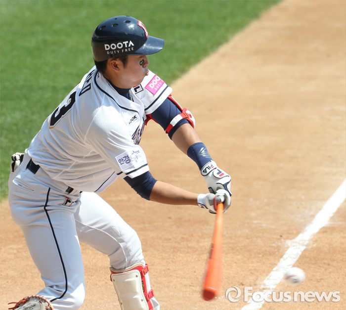 (서울=포커스뉴스) 29일 서울 잠실구장에서 열린 2016프로야구 LG-두산 경기 1회말 2사 만루에서 두산 허경민이 2타점 우전 적시타를 날리고 있다.