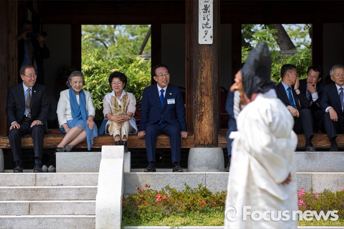 (안동=포커스뉴스) 반기문 UN 사무총장이 29일 오후 경북 안동시 하회마을 방문 하회별신굿탈놀이를 보고 있다.