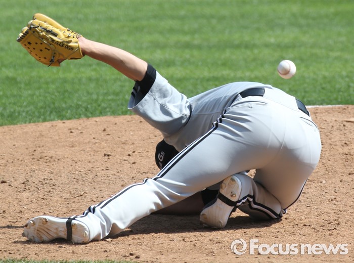 (서울=포커스뉴스) 29일 서울 잠실구장에서 열린 2016프로야구 LG-두산 경기에서 LG 투수 최동환이 동시에 날아온 볼 두개를 피하다 마운드에서 넘어지고 있다.