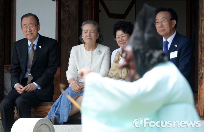 (안동=포커스뉴스) 반기문 유엔 사무총장이 29일 오후 경북 안동시 하회마을 방문 하회별신굿탈놀이를 보고 있다.