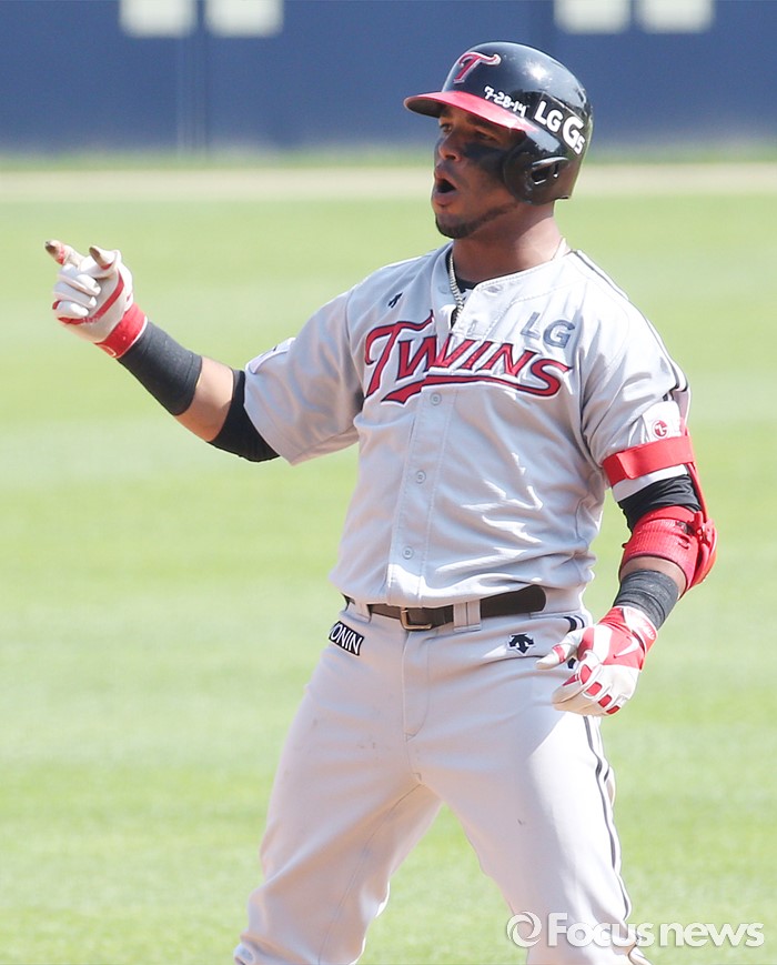 (서울=포커스뉴스) 29일 서울 잠실구장에서 열린 2016프로야구 LG-두산 경기 4회초 2사 1루에서 LG 히메네스가 좌중간 2루타로 타점을 올리며 2루에서 환호하고 있다.
