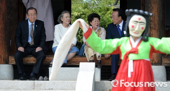 (안동=포커스뉴스) 반기문 유엔 사무총장이 29일 오후 경북 안동시 하회마을 방문 하회별신굿탈놀이를 보고 있다.