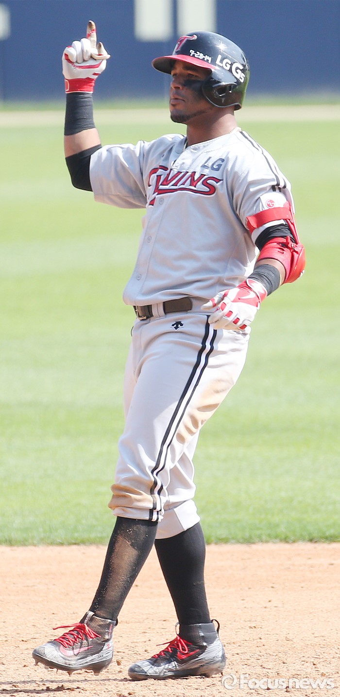 (서울=포커스뉴스) 29일 서울 잠실구장에서 열린 2016프로야구 LG-두산 경기 4회초 2사 1루에서 LG 히메네스가 좌중간 2루타로 타점을 올리며 2루에서 환호하고 있다.