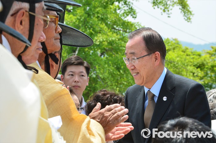 (안동=포커스뉴스) 반기문 유엔 사무총장이 29일 오후 경북 안동 하회마을 충효당을 방문해 시민들과 인사하고 있다.