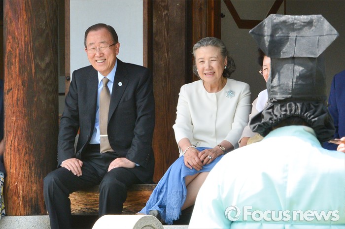(안동=포커스뉴스) 반기문 유엔 사무총장이 29일 오후 경북 안동시 하회마을 방문 하회별신굿탈놀이를 보고 있다.