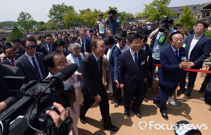 (안동=포커스뉴스) 반기문 유엔 사무총장이 29일 경북 안동 하회마을 충효당 인근에서 기념식수를 마치고 식사자리로 이동하고 있다.