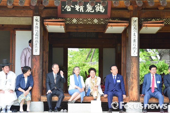 (안동=포커스뉴스) 반기문 유엔 사무총장이 29일 오후 경북 안동시 하회마을 방문 하회별신굿탈놀이를 보고 있다.